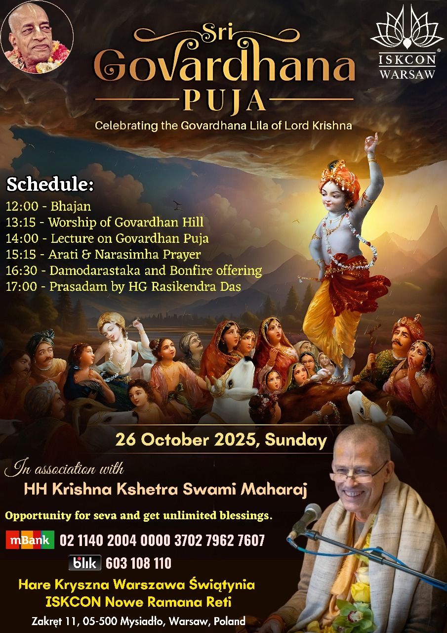Serdecznie zapraszamy na obchody Święta Govardhana Pudży w niedzielę 26 października 2025 roku. Naszym gościem będzie J.Ś. Krishna Kshetra Swami.